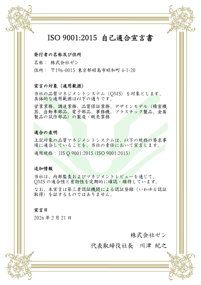 本ページの記載は自己適合宣言であり、「ISO 9001 認証取得」や認証登録を示すものではありません。